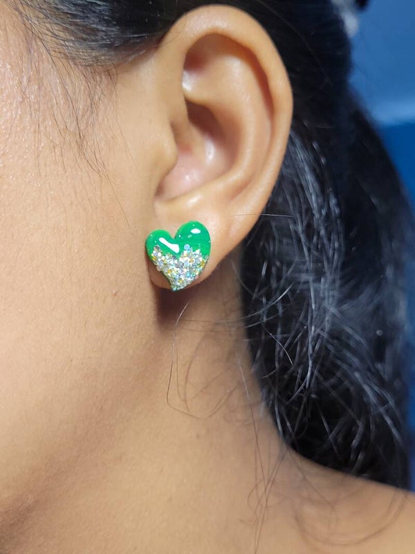 Boucles d'oreilles cœur . Bijou fantaisie fait main, pate polymère et paillettes